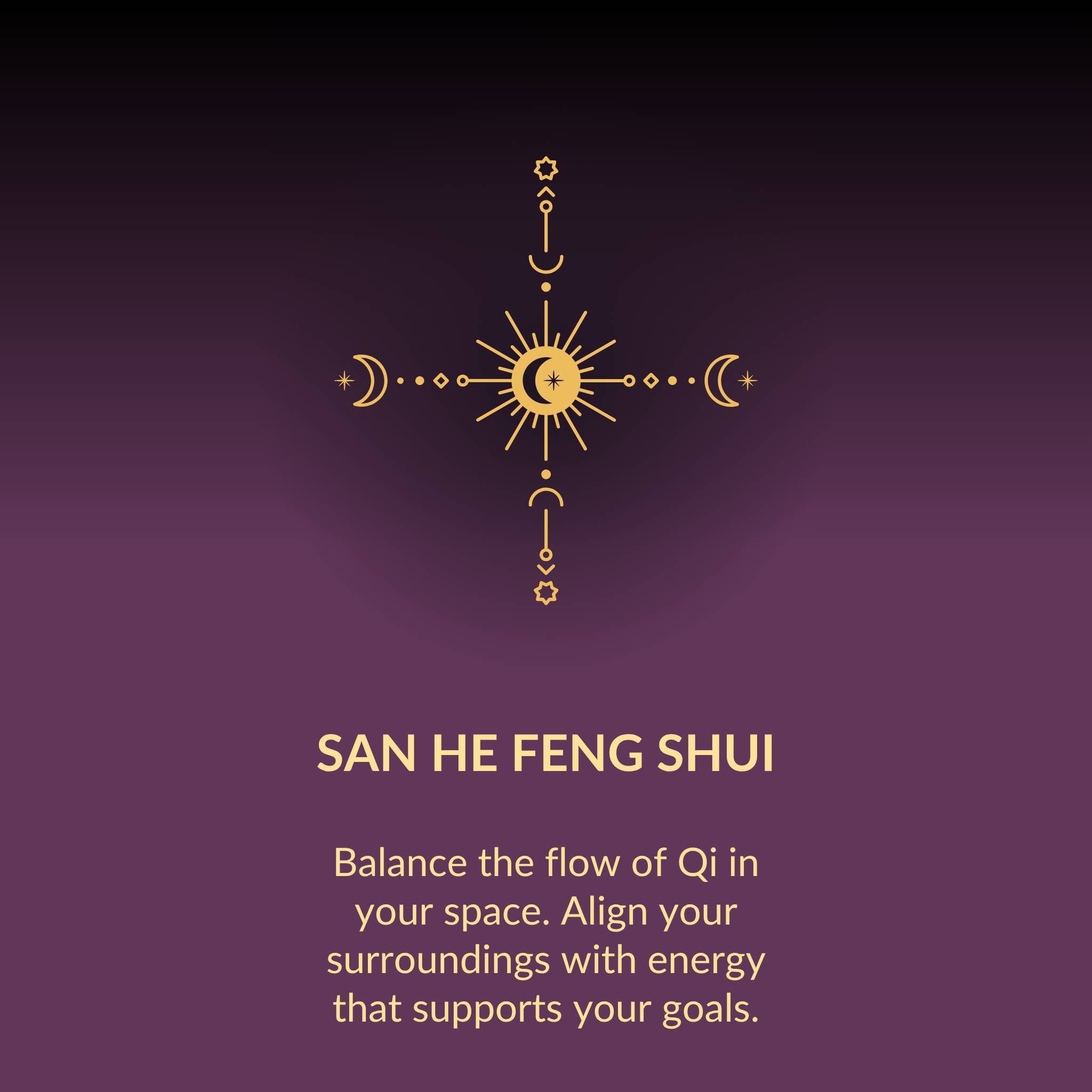San He Feng Shui analyzes the environment and energies surrounding and flowing through a specific place. It aims to harmonize elements. Authentic Feng Shui DOES NOT subscribe to amulets, trinkets, inanimate objects, and the like that claim to bring luck to your life. Feng Shui is about the proper flow of energy.