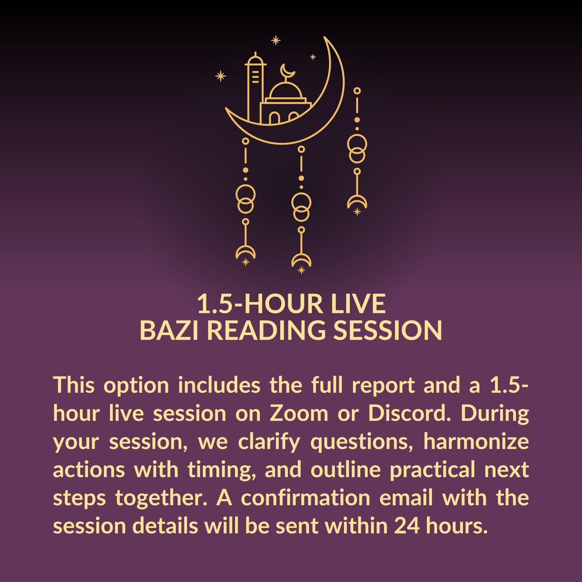 This includes the full report and a 1.5-hour live session in Zoom or Discord. During your session, we clarify questions, harmonize actions with timing, and outline practical next steps together. A confirmation email with the session details will be sent within 24 hours.